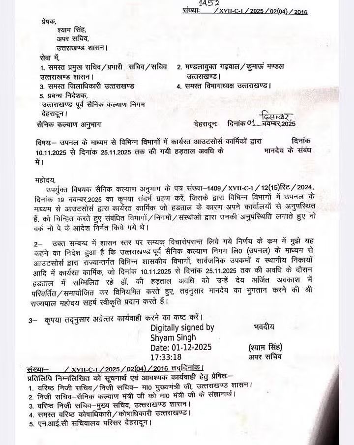 इसी के साथ उपनल कर्मियों की एक और बड़ी मांग—समान वेतन का आदेश—भी अब बहुत जल्द जारी होने वाला है। जानकारी के मुताबिक यह फाइल अंतिम चरण में है और मुख्यमंत्री स्तर से इसकी स्वीकृति मिल गई है। आदेश किसी भी समय जारी हो सकता है।