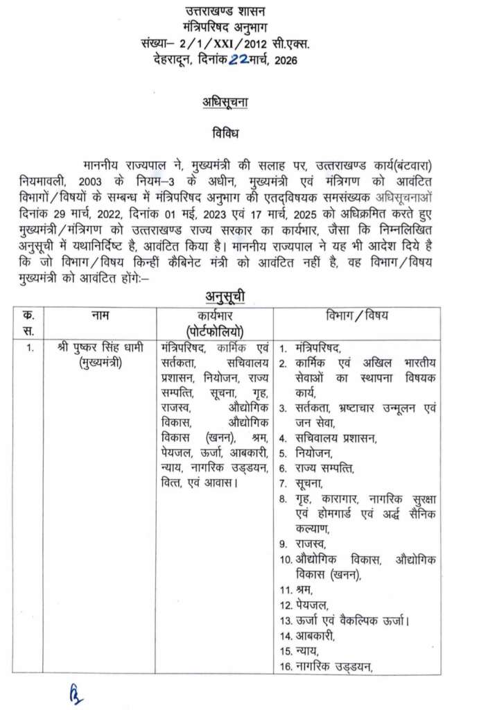 धामी खुद देखेंगे सामान्य प्रशासन, गृह, कार्मिक, नियुक्ति एवं प्रशिक्षण सूचना एवं जनसंपर्क विभाग