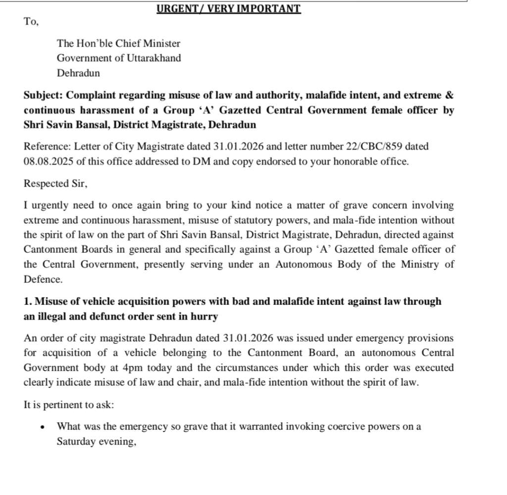 सीईओ ने अपनी शिकायत में स्पष्ट किया है कि कैंट बोर्ड रक्षा मंत्रालय के अंतर्गत आता है और ऐसे में जिलाधिकारी को उनकी गाड़ी अधिग्रहित करने का अधिकार नहीं है। उन्होंने सवाल उठाया कि जब जिले में कोई आपात स्थिति नहीं है, तो उनकी गाड़ी की आवश्यकता अचानक कैसे पड़ गई।