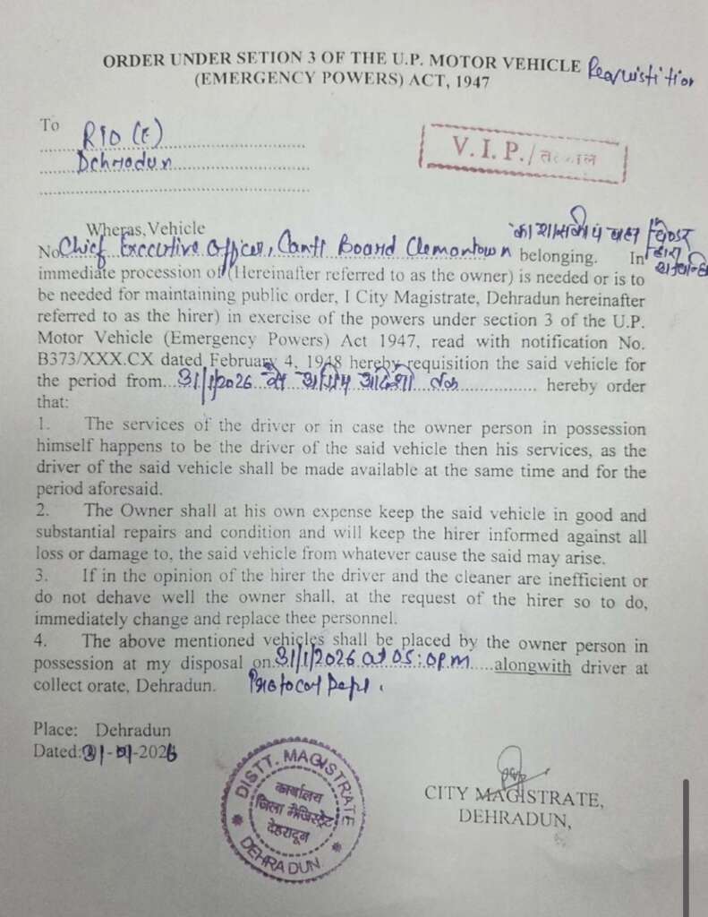 पंचायत चुनावों के दौरान उठे विवाद के बाद एक बार फिर देहरादून के क्लेमेंटटाउन कैंट बोर्ड के मुख्य कार्यकारी अधिकारी निशाने पर आ गये है। शनिवार शाम डीएम कार्यालय की ओर से वीआईपी कार्यक्रम का हवाला देते हुए सीईओ की सरकारी गाड़ी अधिग्रहित करने का पत्र भेजा गया, जिसके बाद मामला फिर तूल पकड़ गया है।