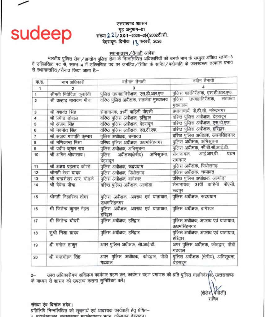 इसी क्रम में पुलिस विभाग में प्रशासनिक स्तर पर आवश्यक तबादले किए गए हैं। यह कदम पुलिस व्यवस्था को और अधिक सक्रिय, जवाबदेह और प्रभावी बनाने की दिशा में उठाया गया है।