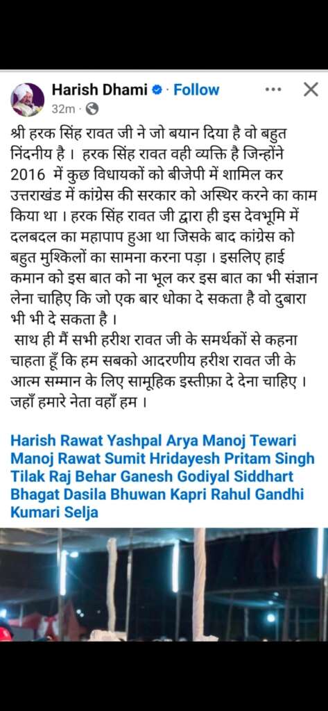 इसके साथ ही उन्होंने पूर्व मुख्यमंत्री Harish Rawat के समर्थकों से बड़ा आह्वान करते हुए कहा कि “हम सबको हरीश रावत जी के आत्मसम्मान के लिए सामूहिक इस्तीफा दे देना चाहिए—जहां हमारे नेता, वहां हम।”