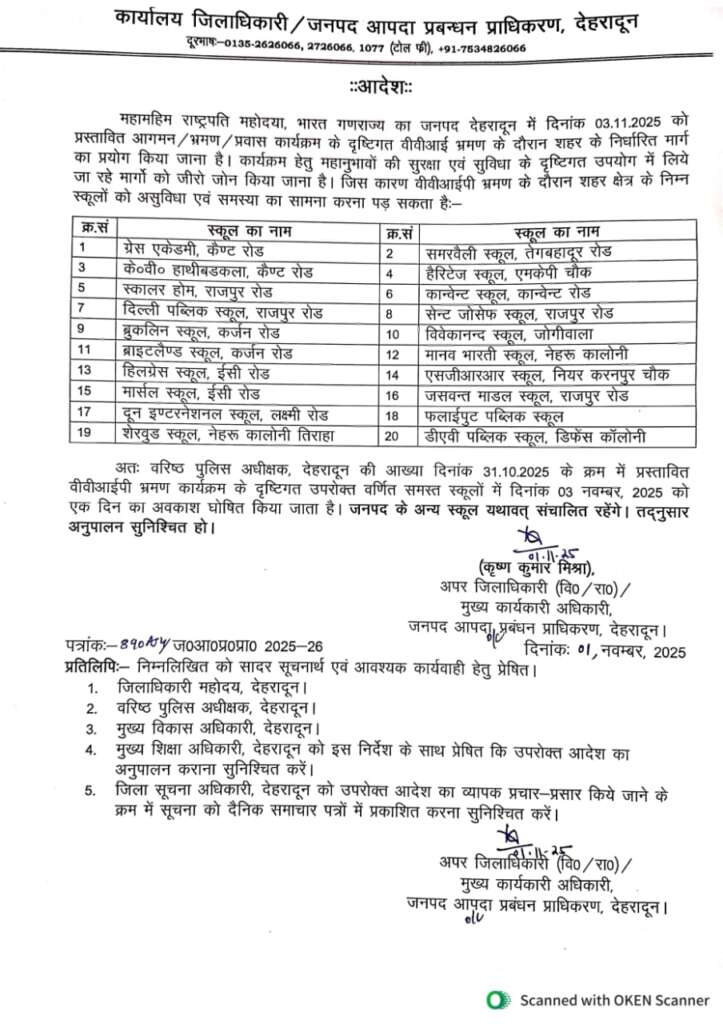 राष्ट्रपति महोदय के प्रस्तावित देहरादून आगमन एवं वीवीआईपी कार्यक्रम के दृष्टिगत जिला प्रशासन ने सुरक्षा और यातायात व्यवस्था के मद्देनज़र शहर के कुछ क्षेत्रों में स्थित विद्यालयों में 3 नवंबर 2025 (सोमवार) को अवकाश घोषित किया है।
