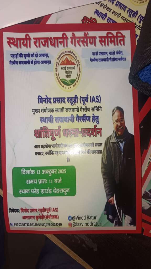 देहरादून। उत्तराखंड की स्थायी राजधानी गैरसैंण घोषित करने की मांग को लेकर पूर्व आईएएस अधिकारी विनोद प्रसाद रतूड़ी एक बार फिर आंदोलन के रास्ते पर उतरने जा रहे हैं। रतूड़ी ने ऐलान किया है कि वे 12 अक्टूबर से देहरादून के परेड ग्राउंड में अनिश्चितकालीन धरना प्रदर्शन शुरू करेंगे।
