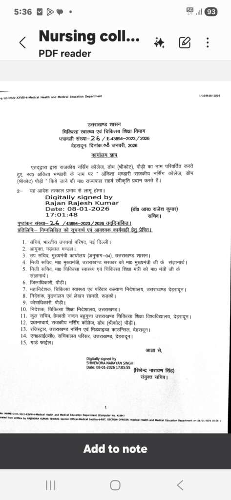 पौड़ी जनपद के श्रीकोट स्थित राजकीय नर्सिंग कॉलेज का नाम अब स्वर्गीय अंकिता भंडारी के नाम पर रखा जाएगा। राज्य सरकार के इस प्रस्ताव को राज्यपाल ने स्वीकृति प्रदान कर दी है। इसके साथ ही अब यह संस्थान आधिकारिक रूप से “स्वर्गीय अंकिता भंडारी राजकीय नर्सिंग कॉलेज, श्रीकोट” के नाम से जाना जाएगा।